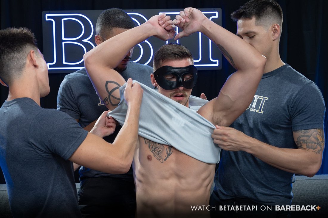 Jaxx climbs on top of Q, sliding his mancunt down the veiny member until its base is engulfed by the quivering lips of his asshole. He bounces, fucking himself on the cock carving deeper into his guts. Unable to control his grunting as Q fills him with the first load of the night, Zander and Cody fill Jaxx’s mouth, silencing him with their cocks.